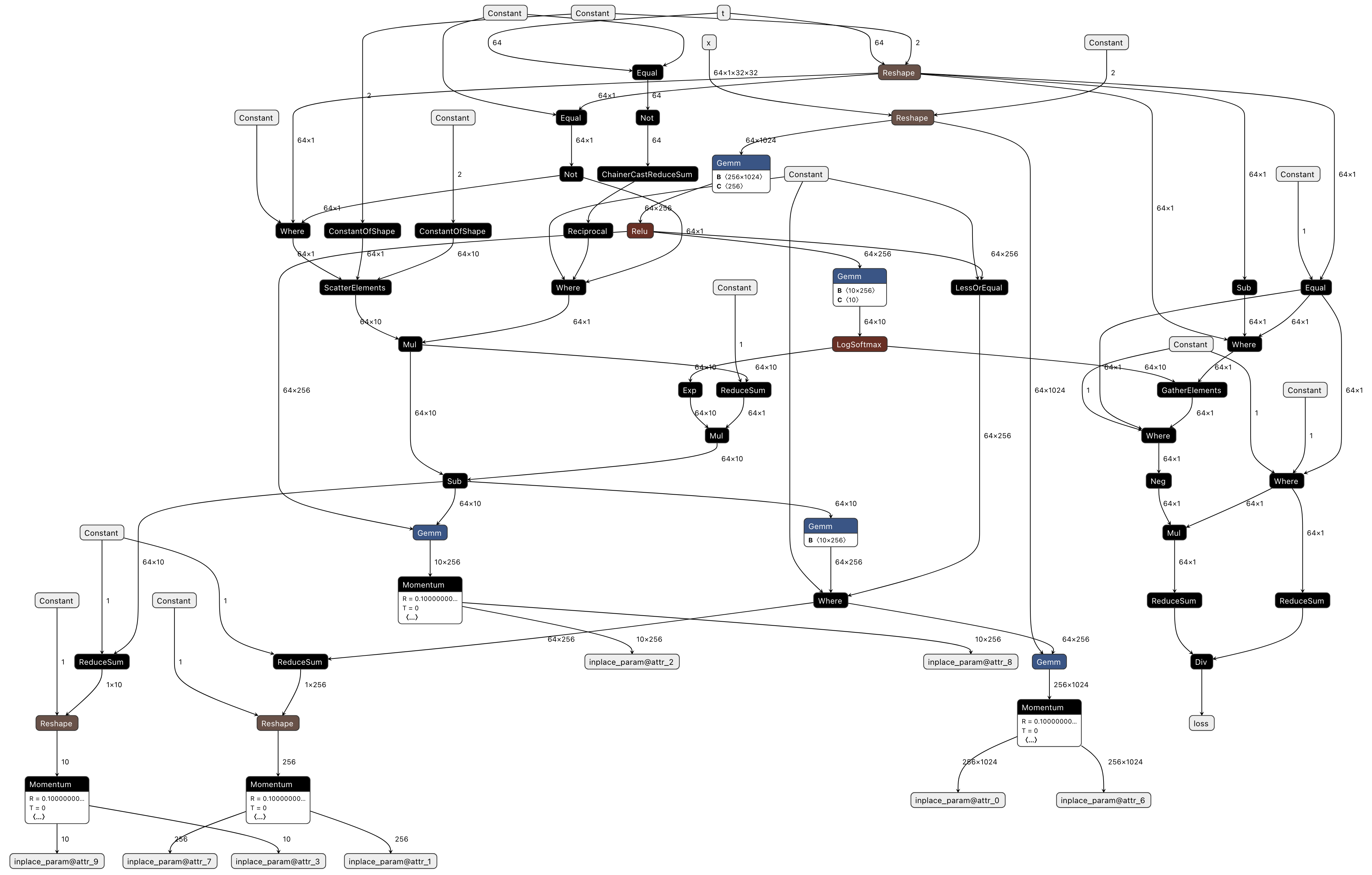 While the MNCoreClassifier itself isn’t particularly large as a model, the number of operators within the MNGraph easily exceeds 100, making it difficult to visualize the ONNX representation and properly map it to the original implementation. For examining the contents of the MNGraph, we recommend checking the l3ir.txt file instead.