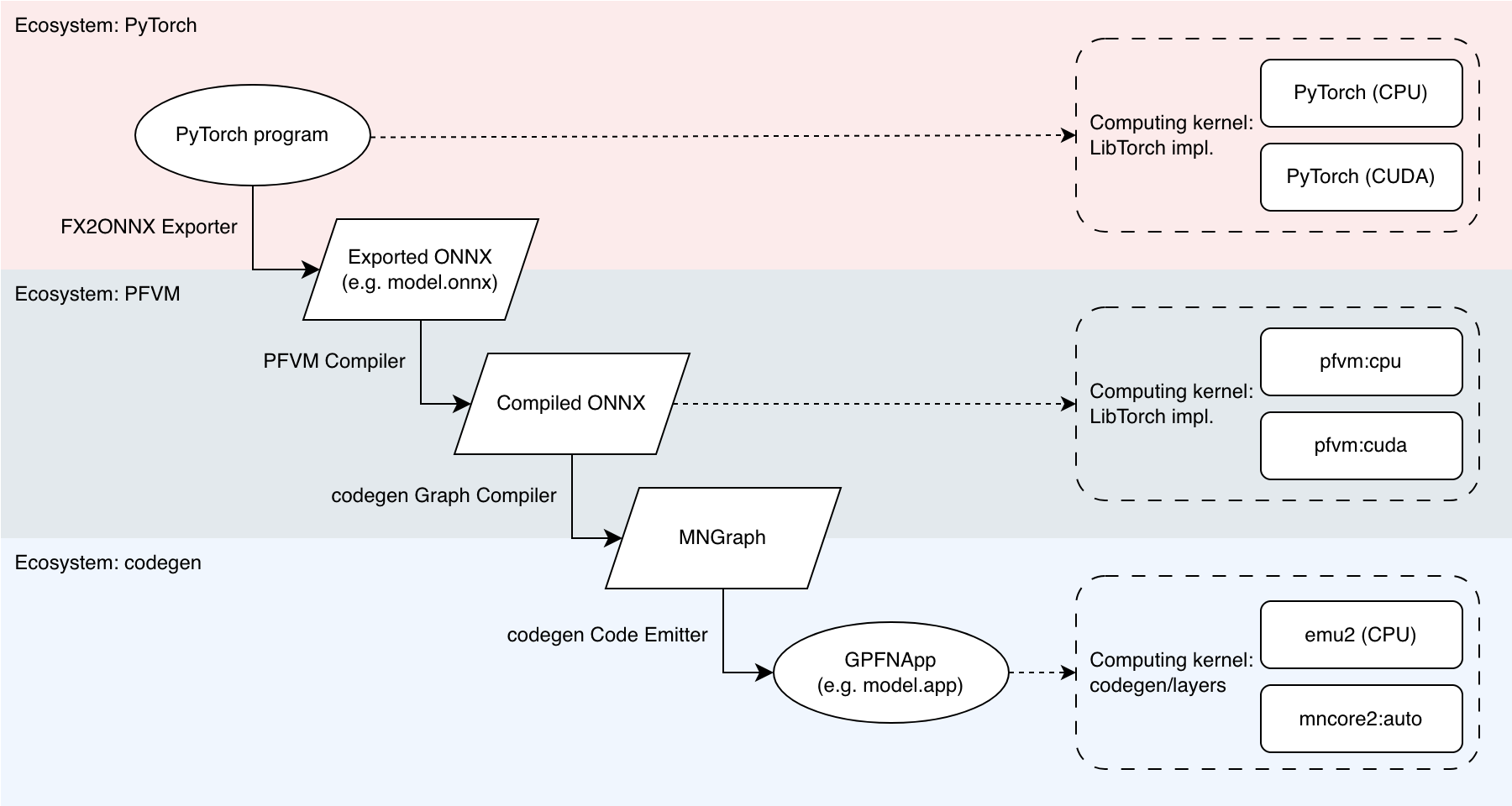 Directly proceeding from PyTorch to codegen involves changes in both graph structure and operator implementations. However, by first going through the PyTorch → PFVM → codegen sequence, you can independently verify both the graph structure and operator implementations.